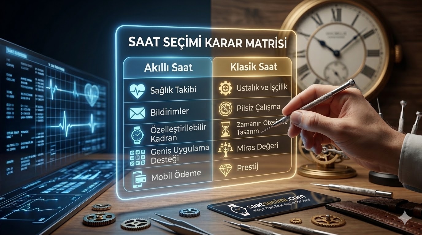 Bir iş toplantısında veya özel bir davette, bileğinizdeki klasik bir saat sizin zevkiniz, karakteriniz ve kaliteye verdiğiniz değer hakkında çok şey anlatır. Akıllı saat ise herkesin bileğinde olan standart bir cihazdır; sizi farklı kılan değil, sürüye dahil eden bir parçadır.