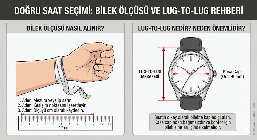 İnce bileklilerin yaptığı en büyük hata sadece kasa çapına (örneğin 42mm) bakmaktır. Oysa saatin boynuzdan boynuza (lug-to-lug) mesafesi bilek genişliğinizi aşmamalıdır.