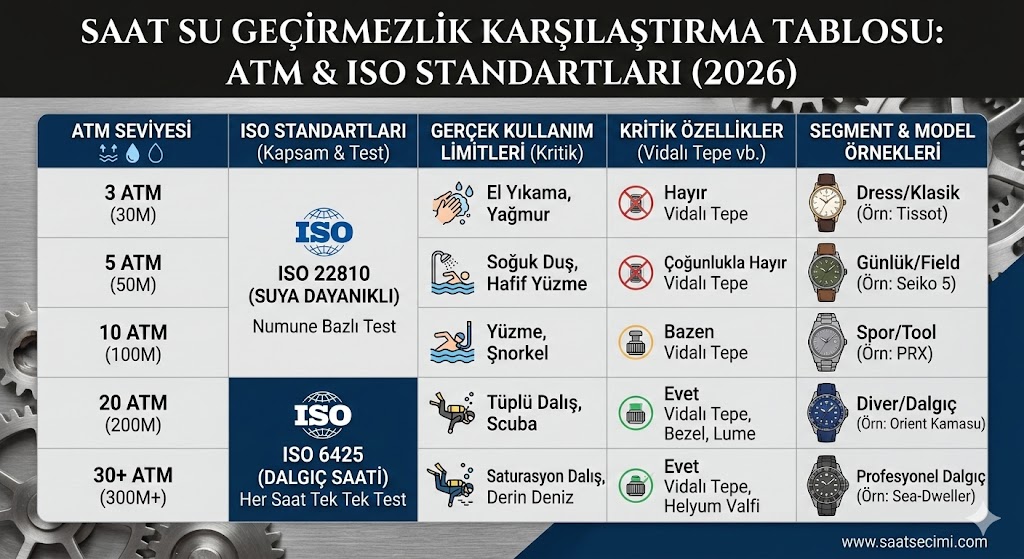 Saatlerdeki 3 ATM veya 50M ibaresi, derinlik değil laboratuvar basınç limitidir. Gerçek bir su teması için en az 10 ATM tercih edilmelidir. Profesyonel bir "Diver" saati arıyorsanız sadece ATM değerine değil, ISO 6425 sertifikasına ve vidalı tepe yapısına bakmalısınız.