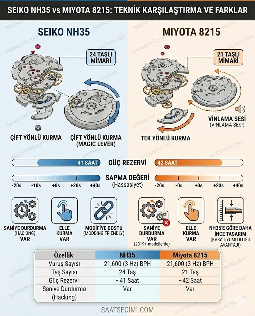 2019+ Güncellemesi (Kritik Bilgi): Eski blog yazılarında Miyota 8215 için "saniye durdurma (hacking) özelliği yok" bilgisini görebilirsiniz. Hatalı! 2019'dan itibaren üretilen güncel 8215 mekanizmalar artık saniye durdurma özelliğine sahiptir. Bu da mekanizmayı NH35 ile tam rekabetçi hale getirmiştir.